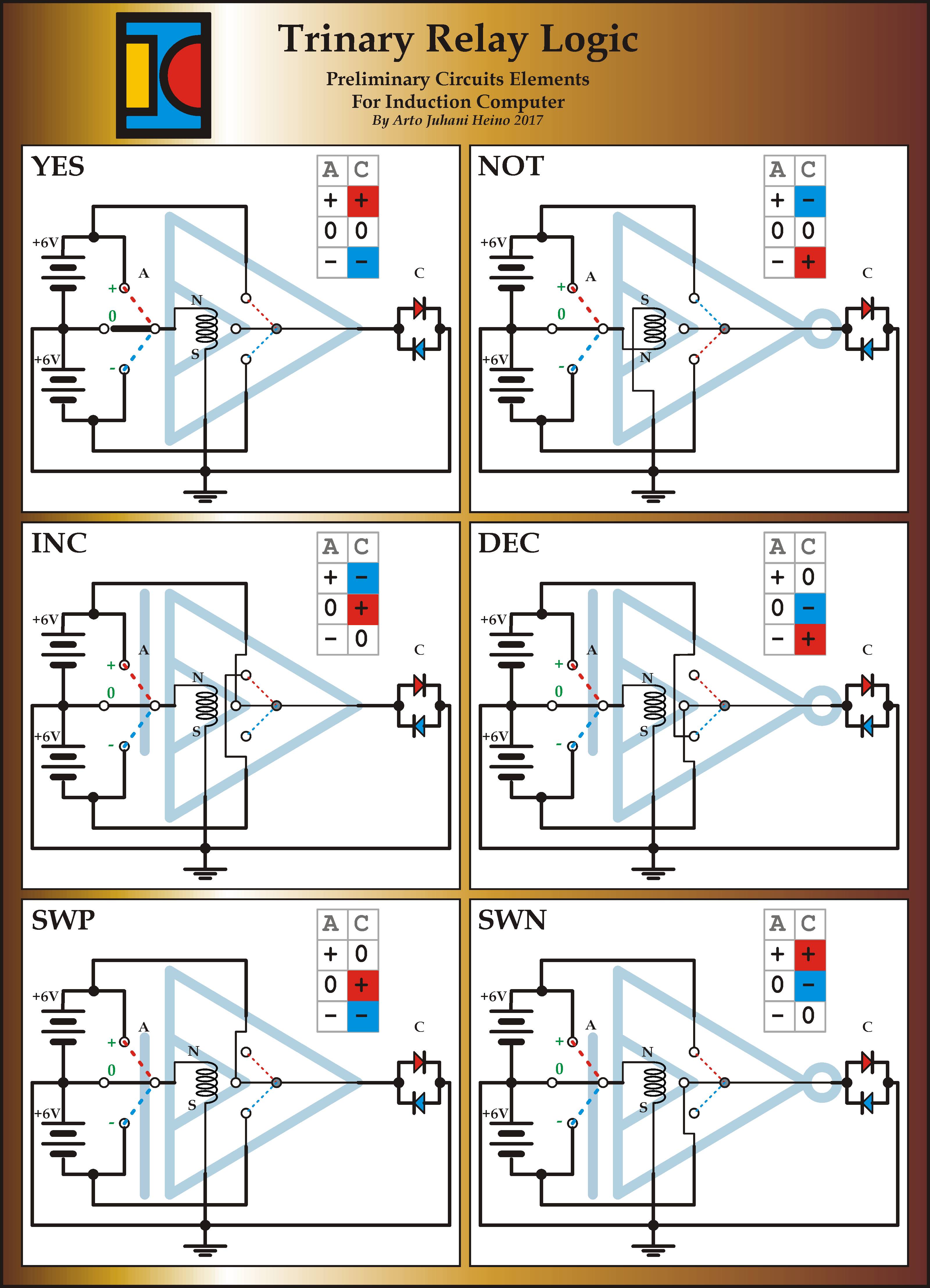 This diagram illustrates the relay design of the three different trinary gates you need here. You can make the relays a small or big as you need . Everything here is simple and easily built on you electronic bench, please feel free to use these gates in a project.