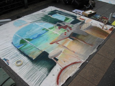 The rain came down on Saturday and most of the artists moved their work into Parramatta Town Hall, thanks for a generous and understanding council. I know the interior lighting changes your colour perceptions, we all tried to compensate for the slight change. We battled on until about 6.00pm. Here is my work at the end of the day.