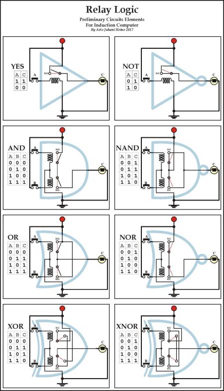 Here are some interesting combinations using relays as logic gates, which was where I began this first step into the Induction Computer.