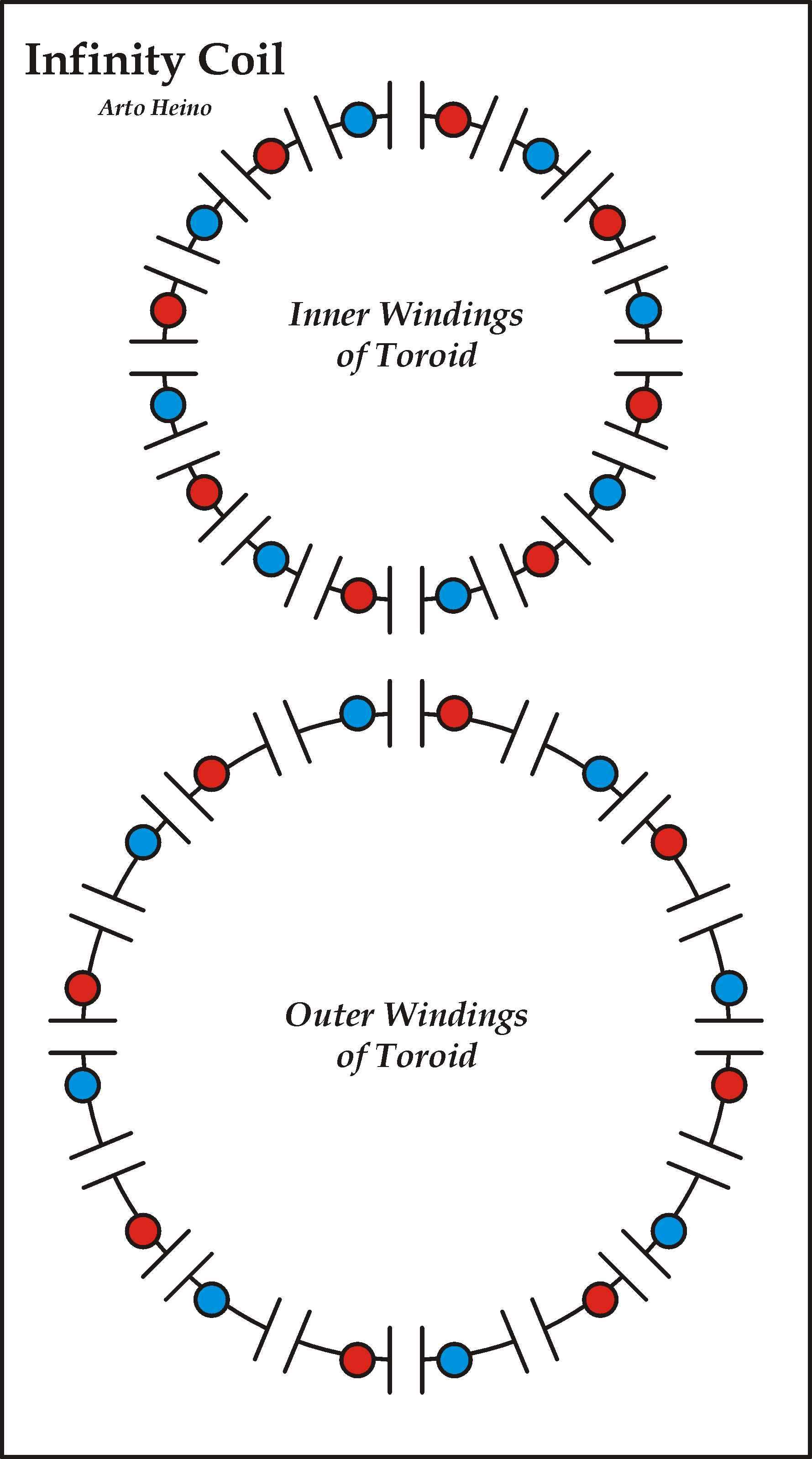 After many years I decided to return back to these designs as they merit greater experimentation. The original Infinity coils were two solenoids in parallel wound in a figure eight fashion, this would also work on two toroids stacked in parallel also adding the bifilar winding scheme, this became my final design as shown below.