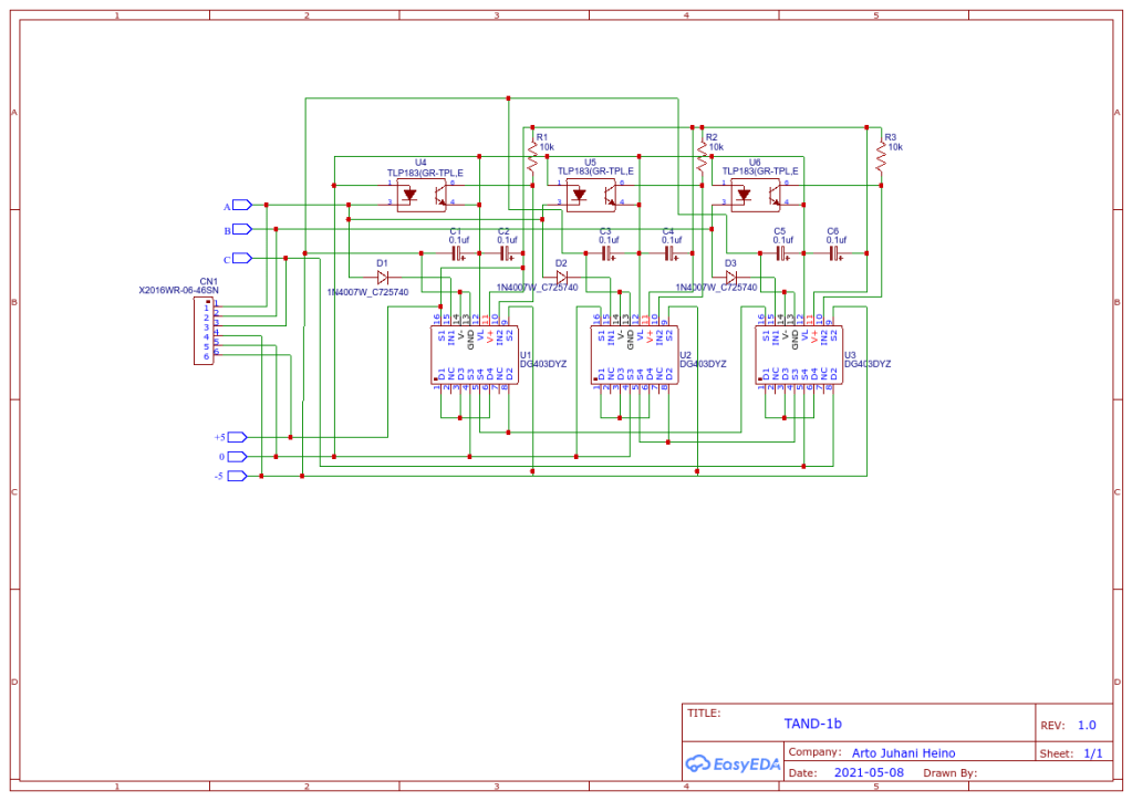 6 x _______________CD4555BE 9 x _______________ADG412BNZ C1,C2,C3,C4,C5,C6 _100 nF Caps D1-D12 ___________1N4007 D19,D20,D21,D22 __1N4007 1 x _______________LM7805 1 x _______________LM7905 C7,C10,C12,C22 ___47uF Electrolytic Caps Led1 _____________Led R1 _______________1K 3 x _______________6 Pin 3 x _______________5 Pin 15 x ______________8 Pin Dip 1 x _______________7 Pin Dip 1 x _______________74LS125