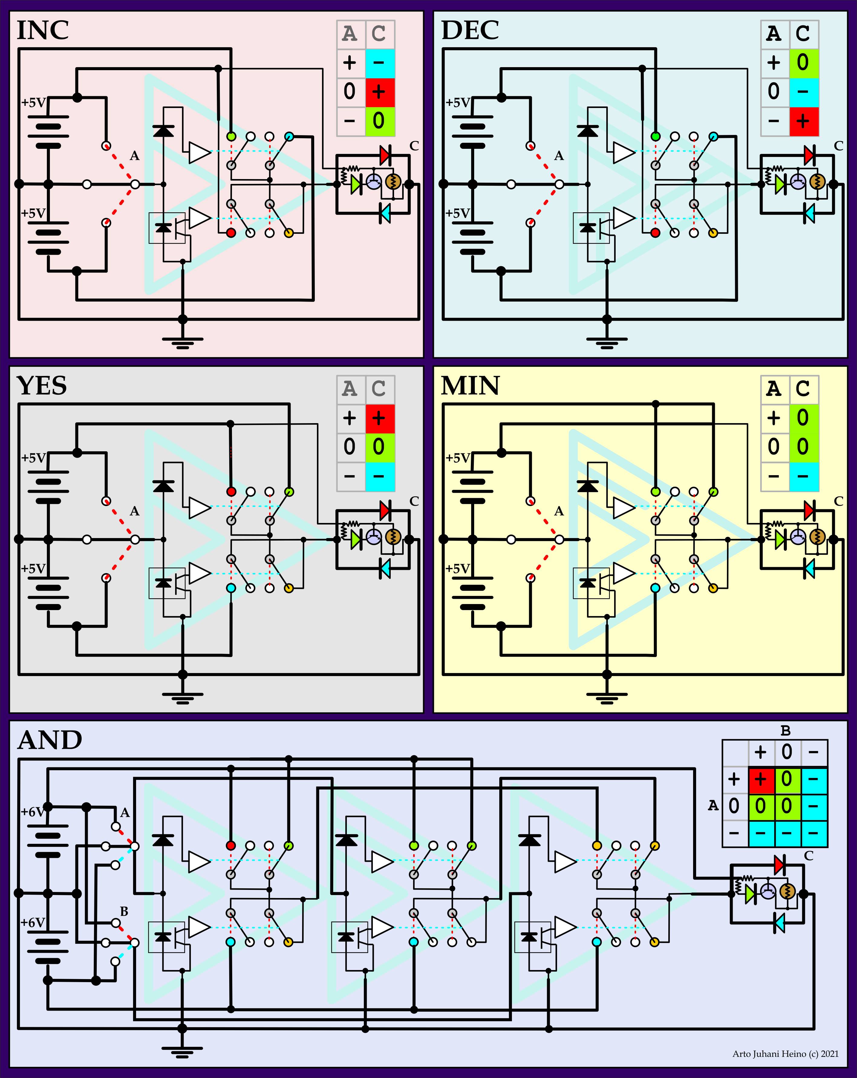 The last design (1D) in this set reduces the Unary Gates to 2, thus allowing a negative as an output, this is mainly for use in other Ternary circuits, like the one I will show in another design (2B).