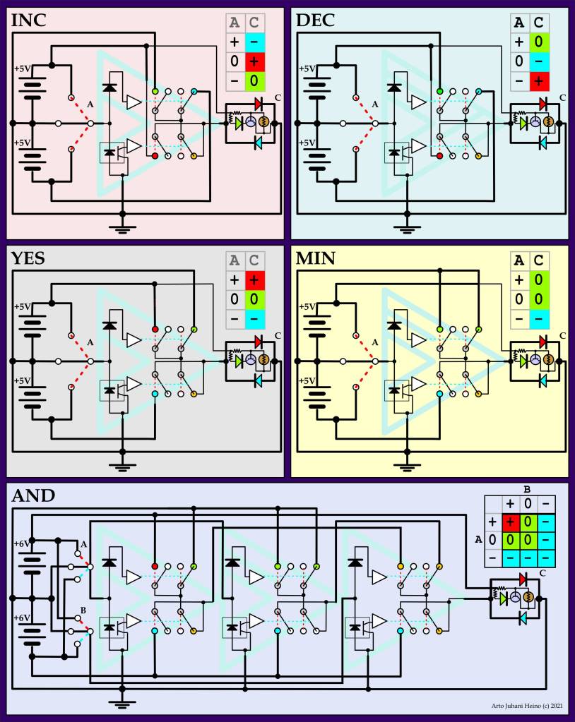 I have used a spread sheet to design the small Unary modules and 2 input Ternary Gate modules to develop these designs, they were based on the Ternary Relay designs I have outlined in my previous work.