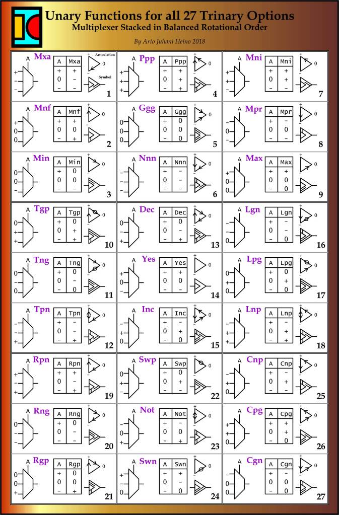 To be clear the multitude of Ternary 2 input gates is a gift to the creative mind, I have written a program that enumerates all 19683 and deemed all of them useful. An example of this is gate 2272 (TAB-index), which is “Tautology” or all “+1”, so any inputs at A and B results in +1 on the output. You might say what is the point of that? Only now it acts like a buffer or a line driver, so it serves a “function” in a ternary circuit or a re-encoder in a more complex circuit. After deciding what is needed to develop a Ternary computer, I first looked to the 27 Unary gates and the all gates that are commonly used in binary circuits, like AND, OR, NAND, NOR etc…which there are a total of 16 and which 6 are deemed the most useful.
